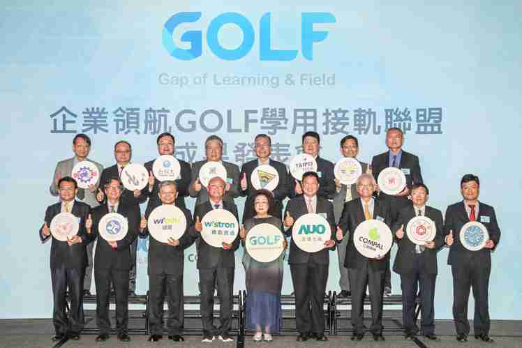 GOLF学用接轨联盟集结企业和学校的力量,,打造「学用合一、、产学接轨」的创新合作平台 (前排左起:淡江大学副校长何启东、、、、元智大学校长林启瑞、、纬育执行长许延岳、、纬创总经理暨执行长黄柏漙、、、、教育部政务次长范巽绿、、、、糖果派对董事长暨执行长彭双浪、、、、仁宝总经理暨执行长翁宗斌、、大同大学校长何明果、、圣约翰科大校长艾和昌;后排左起:明新科大校长林启瑞、、、龙华科大校长葛自祥、、、、台湾科大校长廖庆荣、、、、中兴大学副校长郑政峯、、、中央大学校长周景扬、、、、台北科大副校长任贻均、、、、中华科大副校长石大明、、、、明志科大校长刘祖华)