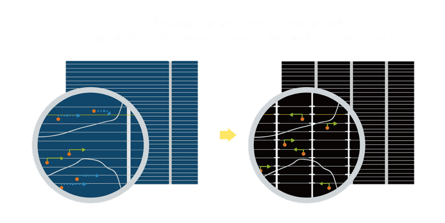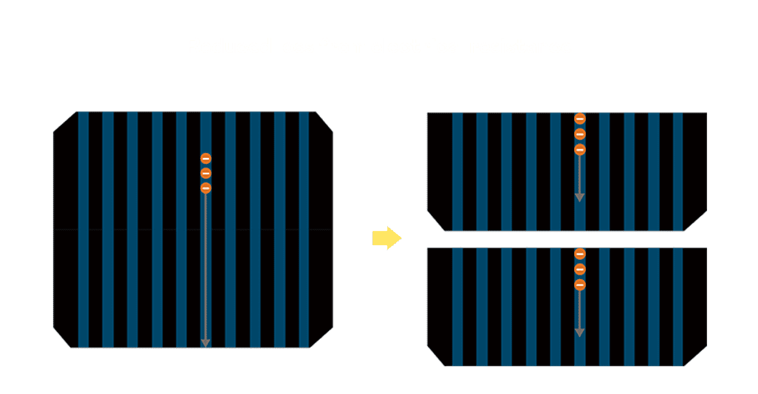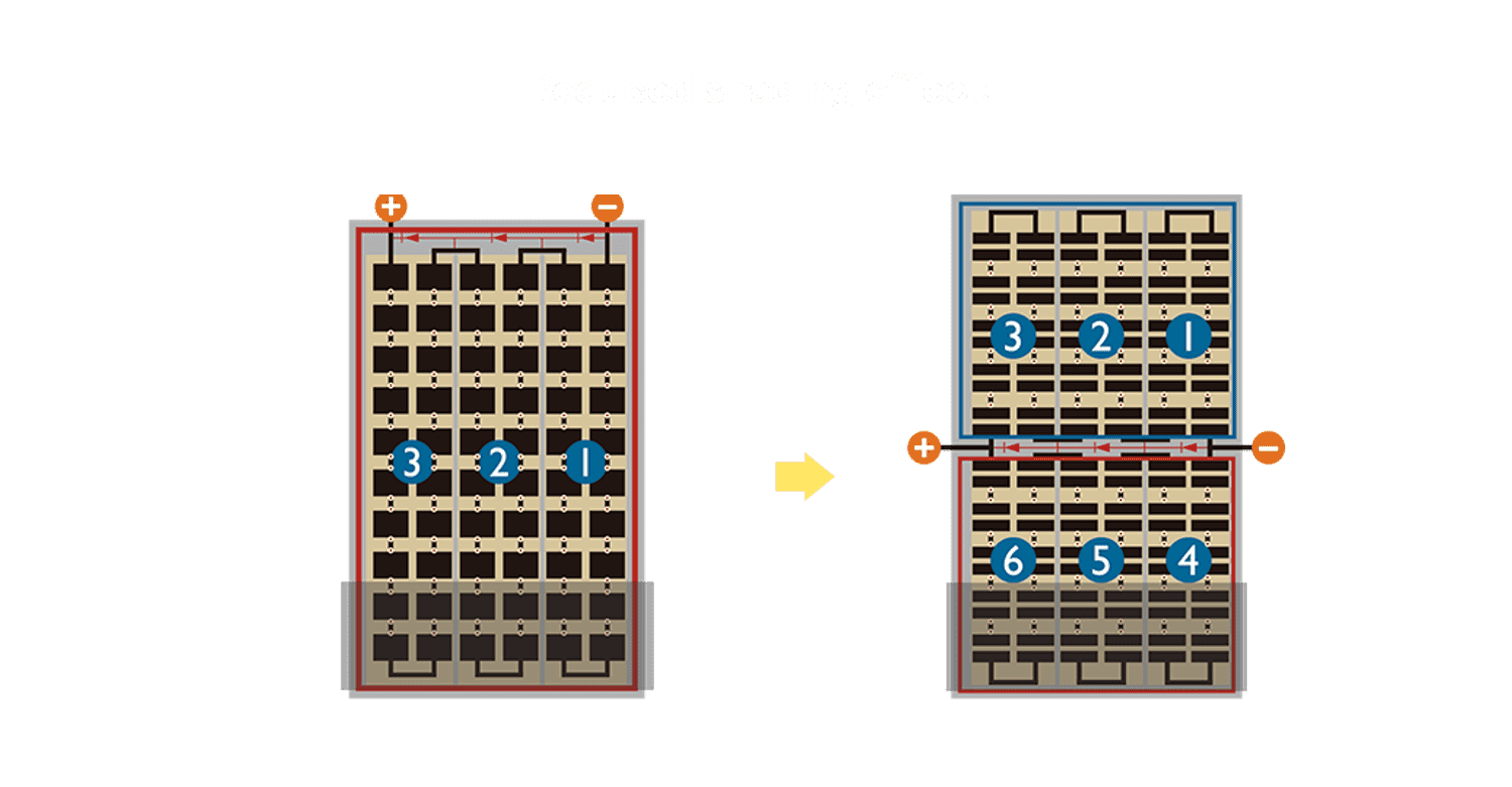 • 结合半切电池,,,,降低遮阴影响、、、提升模组抗隐裂能力、、、、并减少电阻损耗,,,,进一步提升模组发电效能。。。